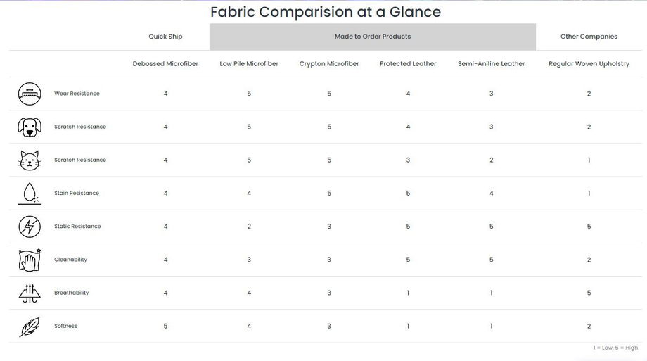 If we based it on the fabric comparison glance guide, Debossed microfiber has the highest score with Softness, and it is our most comfy fabric we offer. It also has low static resistance, which reduces the surface area to which hair clings and allows customer to vacuum or brush off the sofa with ease.