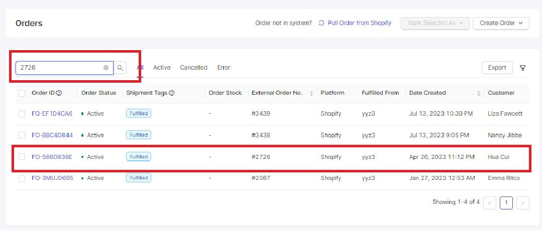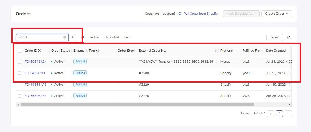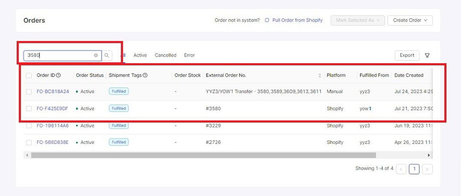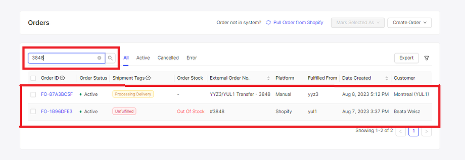 As in the example, there are two results that appear. This indicates that something is happening with the order, and in the first result, you will see that the external order number column has warehouse codes, Transfer and the order number written on it, which means the item must be transferred to another warehouse before being delivered to the customer's address.